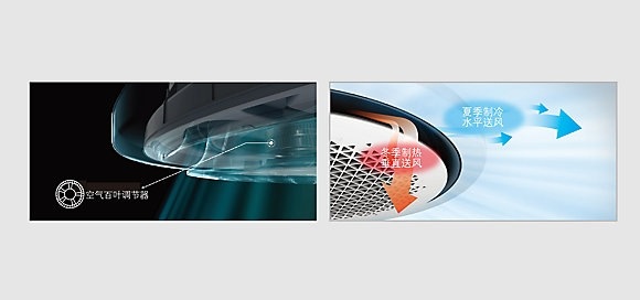 设计空气百叶,突破传统百叶送风角度限制,利用气压调节,实现水平,垂直特殊角度送风,避免吹风感,营造舒适无感气流空间。